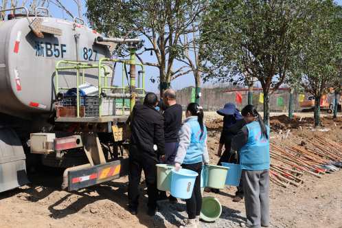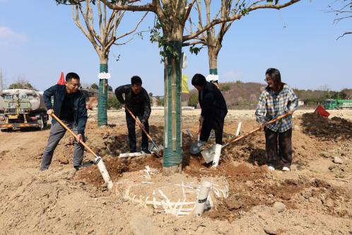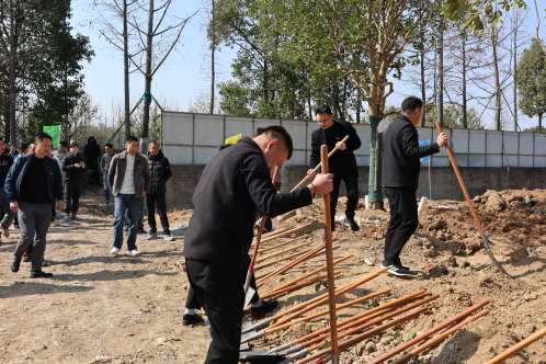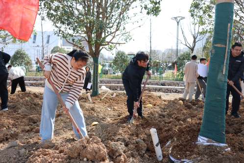 党员们自由组合,分片包干,迅速投入到热火朝天的劳动中。大家严格按照技术指导,分工协作、配合默契——有的挥锹挖坑,有的扶苗培土,有的提水浇灌。尽管春寒料峭,但现场一片火热景象。经过一个半小时的辛勤劳动,一株株新苗迎风挺立,为初春的茗山公园增添了盎然生机。