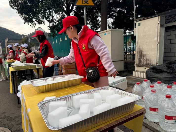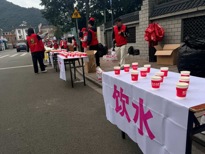 金峨生态工会志愿服务队的补给点,恰好设在全程马拉松22.5公里处——溪口镇武岭公园旁。这里是赛程的关键节点,跑友们经过前半程的消耗,正需要及时的能量补充。