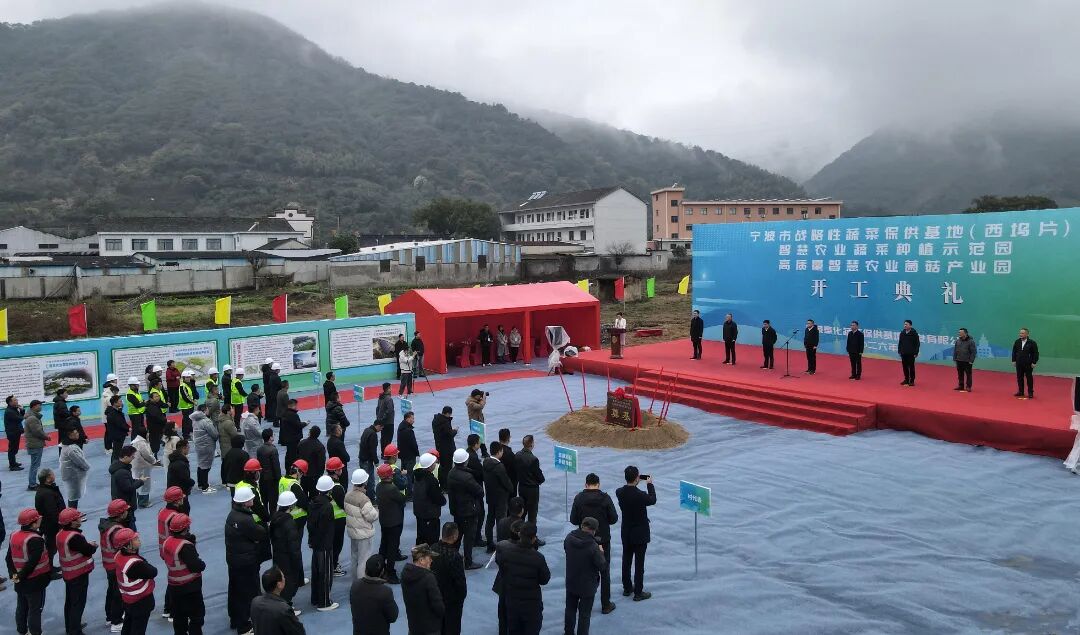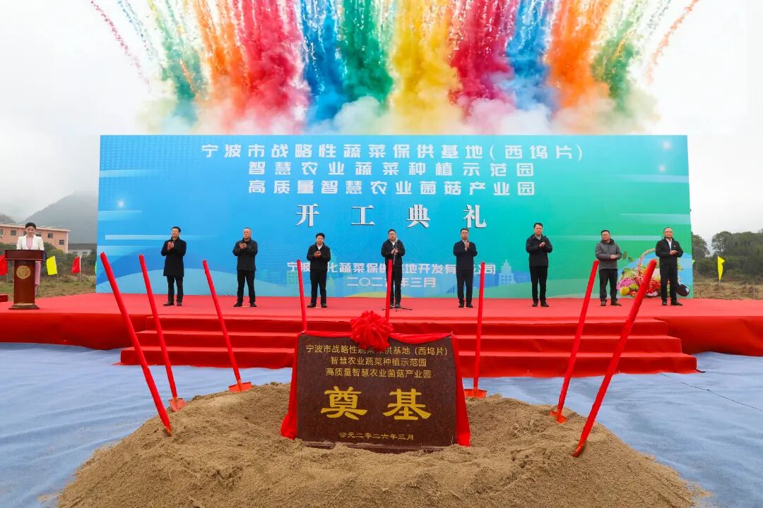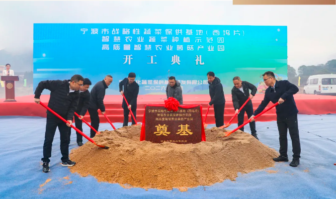 3月5日,浙江省农业“双强”重大项目、市级重点工程宁波市战略性蔬菜保供基地(西坞片)二期项目在奉化区西坞街道正式开工建设。奉化区委副书记、副区长陈啸,奉化区西坞街道党工委书记王刚,奉化区农商控股集团有限公司党委副书记、总经理胡朝安,奉化区农业农村局副局长、党委委员董静勇,宁波农商发展集团有限公司党委副书记、副董事长、总经理杨茂印等领导出席开工奠基仪式。
