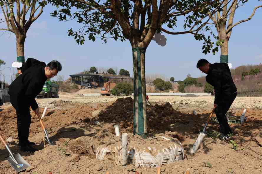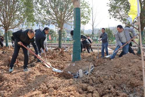 党员们自由组合,分片包干,迅速投入到热火朝天的劳动中。大家严格按照技术指导,分工协作、配合默契——有的挥锹挖坑,有的扶苗培土,有的提水浇灌。尽管春寒料峭,但现场一片火热景象。经过一个半小时的辛勤劳动,一株株新苗迎风挺立,为初春的茗山公园增添了盎然生机。