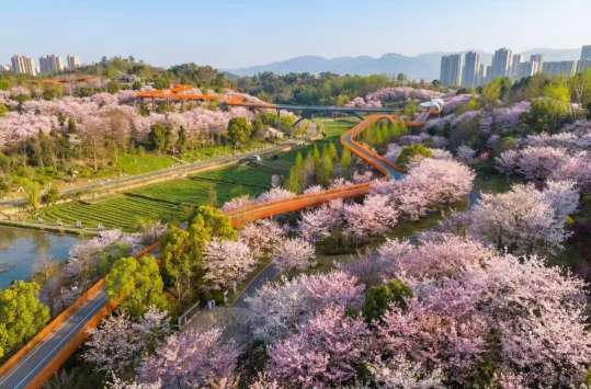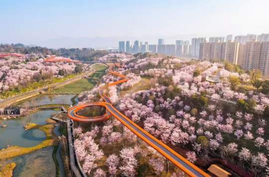 公园里的樱花已经陆续绽放,与起伏的地形完美融合,走在樱花树下,仿佛置身于浪漫的春日仙境,真正体会到了“行止随心,步移景易”的惬意。据了解,园内栽种的樱花品种丰富,除了“染井吉野樱”的粉白与“八重红垂枝樱”,还有迎春樱、钟花樱等,这里将成为市民慕名前来的赏樱胜地。