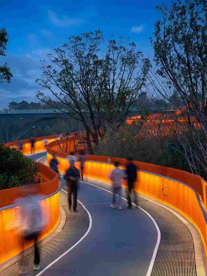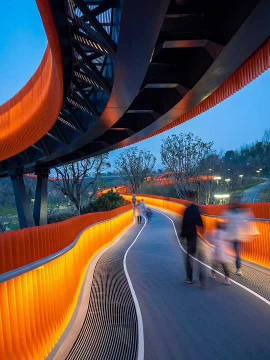 最让人惊艳的,当属园内的架空景观栈道。鲜亮的橙色栈道如一条飘逸的丝带,轻盈地缠绕在青山翠谷之间,凌空而起,将全园的美景串连成线。这里不仅是亲子友好的自然乐园,也是宠物友好的休闲胜地。